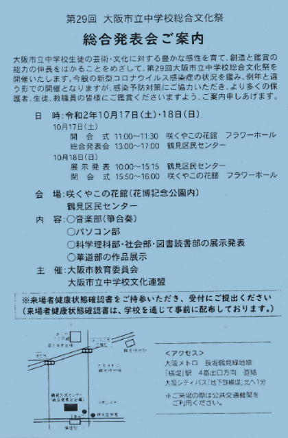 第29回大阪市立中学校総合文化祭 総合発表会が17日(土)・18日(日)に咲くやこの花館(花博記念公園内)および鶴見区民センターで開催されます。主催は大阪市教育委員会 大阪市立中学校文化連盟で、内容は音楽部(箏合奏)、パソコン部、科学理科部・社会部・図書読書部の展示発表、華道部の作品展示です。招待状がない方は入館券の購入が必要なこともあります。来場者は健康状態確認書が必要となりますのでご理解・ご協力をお願いします。