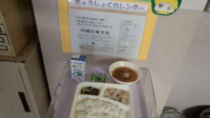 鶏肉のゆず塩焼き ソーキ汁 もやしとさんどまめの甘酢あえ まっ茶大豆 ごはん 牛乳