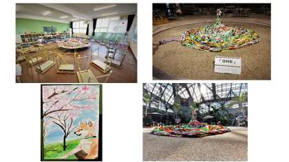 なかでも20校の美術部、総勢427名が作品参加したワークショップ テーマ「ONE」、各校で制作された材料を、大阪市立長吉六反中学校に集め、再び繋ぎ合わせてひとつの大きな作品に仕上げ、完成させました。素材は「布」です。東三国の美術部も参加しました。この作品は今週25日まで、咲くやこの花館で展示しています。ぜひお時間が許せば足をお運びいただけたら幸いです。