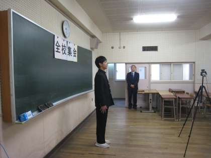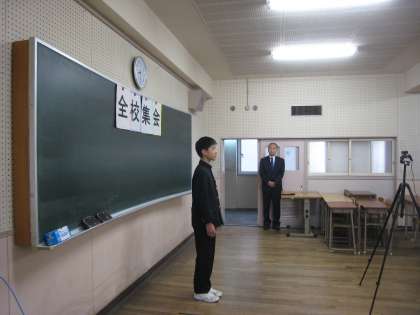 今日の話の中で、以前もお話をしましたが、今日からプールの改修工事等がはじまりますので工事関係者の方が大勢運動場に出入りします。東三国中生としてしっかりとあいさつを心がけましょう。次に、生徒会からは風紀委員会と美化委員会から連絡・報告とお願いがありました。とくに美化委員会からは「東三国史上一番キレイな校内になるように校内美化に務めよう」と声掛けがありました。綺麗な学校で学校生活を送りたいですね。