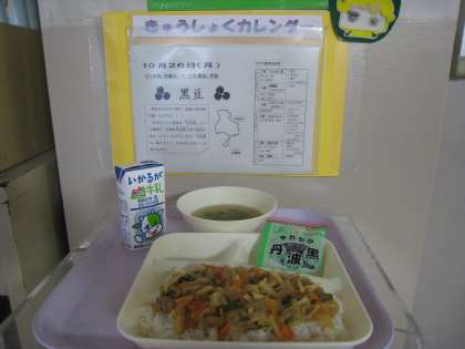 ピリ辛丼 中華スープ ソフト黒豆 ごはん 牛乳