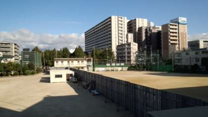 万能鋼板が設置された運動場の工事エリアに現場事務所が設置されました。来年の10月まで予定されている長期間の工事では工事関係者の皆様、安全第一に事故ゼロでお願いします。