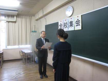 今日(2日)の全校集会で、10月に開催された第29回大阪市立中学校総合文化祭に展示作品を出品した11名に中学校文化連盟から賞状が届きましたので、賞状伝達をはじめに行いました。受賞した1年生3名、2年生5名、3年生3名おめでとうございます。