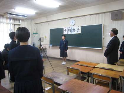 つぎに、体育委員会から工事に伴って運動場に塀が立っているので昼休みの休憩時間にボールで遊ぶ場合など気を付けましょう。ボールが塀を越えて工事エリアに入ったら周りの先生に声をかけましょうとの呼びかけがありました。また、今日の午後からの文化発表会では吹奏楽部の舞台発表がありますと吹奏楽部の代表からのあいさつがありました。