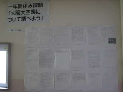 平和学習「大阪大空襲について調べよう」というテーマでたくさんのレポートが展示されていました。