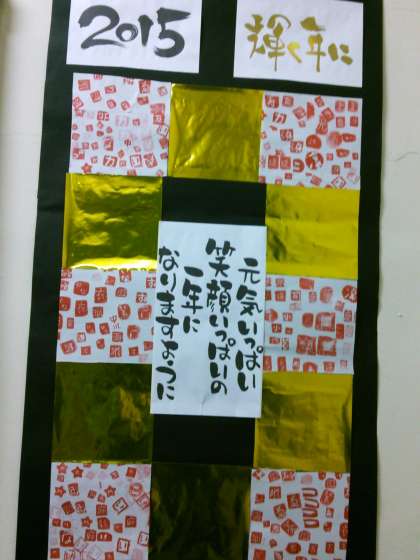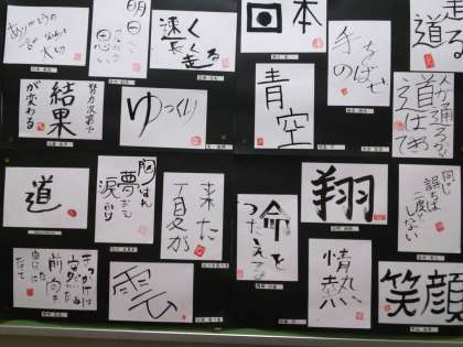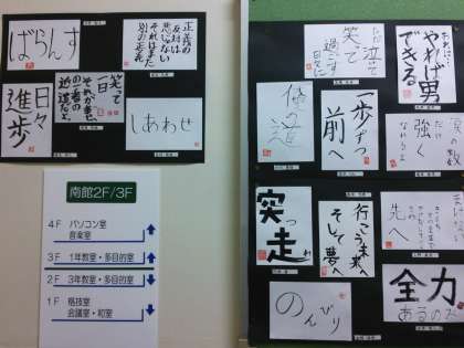 1年生の校舎の階段踊り場に、国語科の作品が掲示され、みんなの