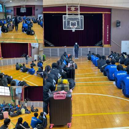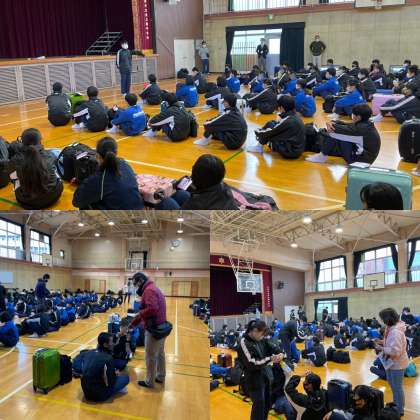 体育館に集合した58期生は検温をすませてから出発式を行いました。10名の先生方と2名の添乗員さん、カメラマン1名で行ってきます。