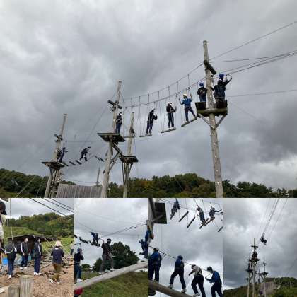 ひこねスカイアドベンチャーでは、男女別でインストラクターの方が班について指導してくれています。男子はハイエレメント、女子はローエレメントからです。先生方も一緒にアスレチックに挑戦です。
