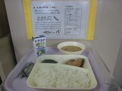 なまりぶしのしょうが煮、みそ汁、ほうれんそうのおひたし、焼きのり、米飯、牛乳