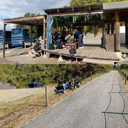 お昼ご飯もグループごとにお弁当タイムです。お天気も戻って陽が当たると温かく感じます。男女が入れ替わってアスレチックを女子も楽しんでいます。8メートルの高さ怖くないのかな。先生も頑張っています。