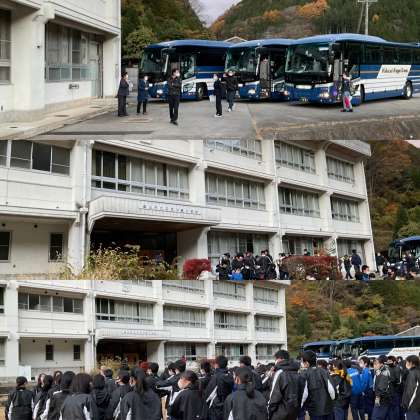 気温は5℃、冷たいですね。入村式はしおりでは、丹生川支所となっていますが、日没の関係で旧丹生川東小学校の運動場で行います。各分宿の方が集まってくれています。皆んなでしっかりとあいさつしましょう。よろしくお願いします。