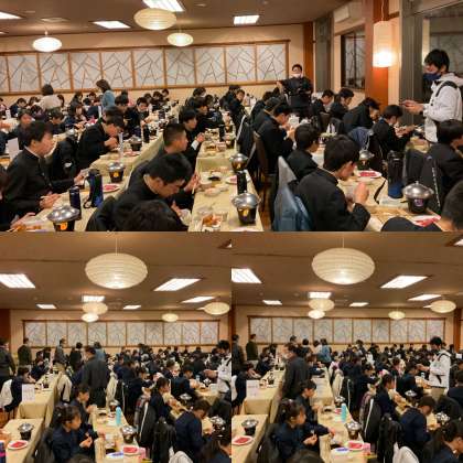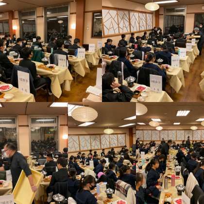 豪勢なお料理いただきます。すき焼きうどん入りも付いてます。みんなの好きな唐揚げや茶碗蒸し美味しそうですね。
