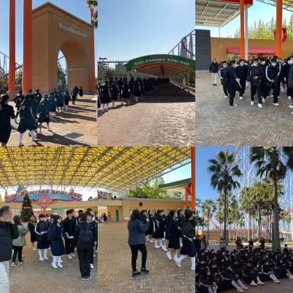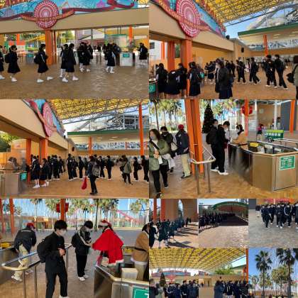 すでにパーク内を班で楽しんでいます。その前にゲート前に移動し、諸注意がありました。