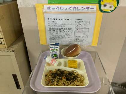 ウインナーときのこのしょうゆ風味スパゲッティ 焼きとうもろこし 発酵乳 黒糖パン1/2 牛乳