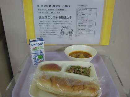 豚肉のカレー風味焼き ケチャップ煮 りんご おさつパン 牛乳