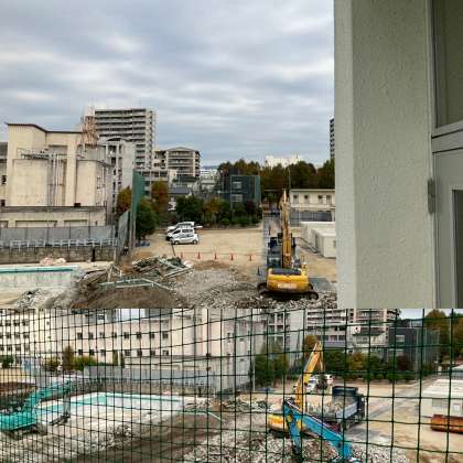 昨日(24日)、工事関係者との定例会議がありました。工事は予定通りに進んでいるとのことです。また、斫りの音が大きくなる工事は土曜日に行う予定とのことでした。今日は大型ダンプが工事エリアに入って瓦礫の運び出しをしていました。