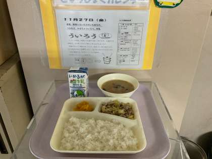 豚肉とまいたけのいためもの つみれ汁 かぼちゃういろう ごはん 牛乳