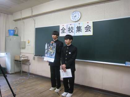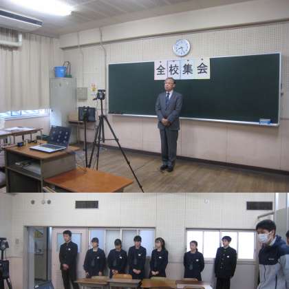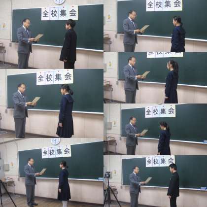 今日(30日)のリモートによる全校集会では、校長先生から表彰状と感謝状の伝達がありました。国語科で取り組んだ公益財団法人生命保険文化センターが主催する第58回中学生作文コンクールで都道府県別部門の大阪府佳作賞に輝いた1年生から3年生の7名に表彰状が手渡されました。また、先週連絡しましたが生徒会が取り組んだ赤い羽根共同募金に対しての感謝状も披露させていただきました。引き続き東三国中学の皆さんの活躍、頑張りを応援したいと思います。美化委員会からは今週末の土曜日に行う地域清掃についての連絡がありました。十八条東公園を1・2年生できれいにする取り組み、みんなでとくに落ち葉を何とかしましょう。よろしくお願いします。風紀委員会からはこれから寒くなるので防寒具についての取り扱いについて再度の注意がありました。コロナも大変だけど風邪も嫌ですね。水曜日からの期末テストを頑張るためにも「うがい・手洗い・消毒、早寝・早起き・朝ごはん」健康第一で乗り切りましょう。