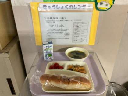 さけのマリネ 肉だんごと麦のスープ プチトマト おさつパン 牛乳