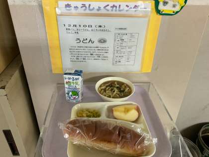 カレーうどん はくさいのおひたし りんご 黒糖パン 牛乳