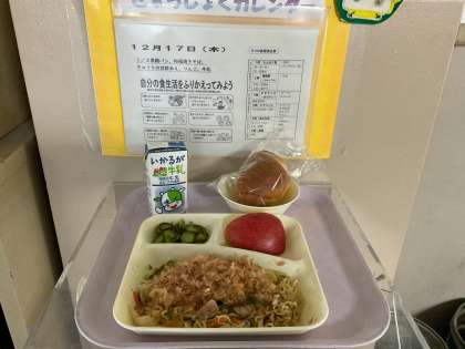 和風焼きそば きゅうりの甘酢あえ りんご 黒糖パン1/2 牛乳