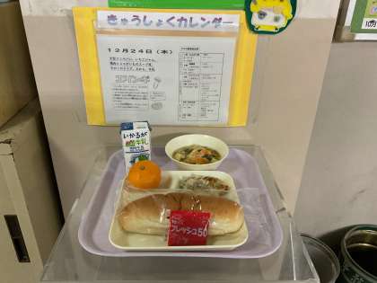 鶏肉とじゃがいものスープ煮 きのこのドリア みかん 大型コッペパン (いちごジャム) 牛乳