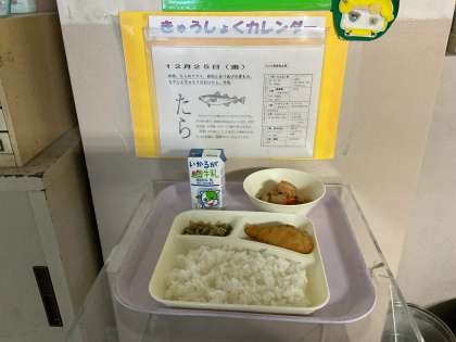たらのフライ 豚肉とあつあげの煮もの もやしときゅうりの おひたし ごはん 牛乳