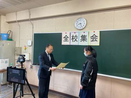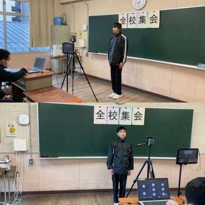 今日(18日)はリモートによるオンライン全校集会でした。初めに全国大会で優勝した3年生へ伝達表彰を行いました。年末の25日にさいたま市サイデン科学アリーナで開催されたさいたま市ハンドボール連盟主催の「さいたまCITYCUP全国中学生ハンドボール交流大会」で大阪府の代表選手の一人として参加した58期生の仲間が活躍をして優勝を勝ち取ってきました。皆さんに非常にうれしい報告ができました。また、風紀委員会からは寒くなって手をポケットに入れている人が見られるので注意がありました。重ねて2分前行動ができていますかという呼びかけもありました。一人ひとりの意識、気持ちが大切ですね。生徒会からは今週末の土曜日(23日)に開催される大阪市スマホサミットの話がありました。子どもたちがネットリテラシーについて考え、インターネットを利用する際の正しい知識や人権感覚を身につけたうえで、スマートフォン等を使用することができるようにしていくことが大切ですね。