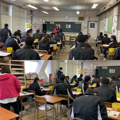 東三国中学校では2学期にも実施した先生方の授業研究、授業相互参観に今週月曜日から取り組んでいます。今日(20日)の1時限目は3年1組の美術の授業、そして4時限目は1年2組の英語の少人数授業を参観しました。美術の授業は「透視図法で平面構成をしよう」という題材で取り組んでいました。3年生は授業の残りもそろそろ見え始めてきているところで、一生懸命に行っていました。また、1年生の英語の授業は少人数での授業ということもあり一人ひとりが集中して頑張っていました。どちらも普段と変わらない授業だったと思います。明日もどこかのクラスの授業を参観する予定で、楽しみです。