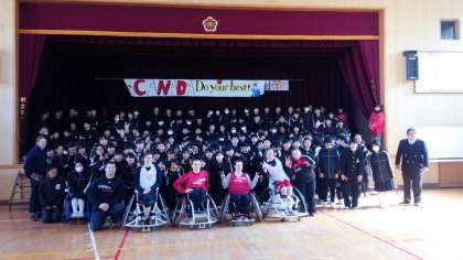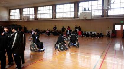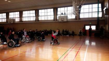 デモンストレーションの後は、2年生を中心に、実際に車いすバスケの体験です。