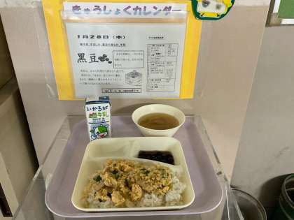 親子丼 すまし汁 黒豆の煮もの 牛乳