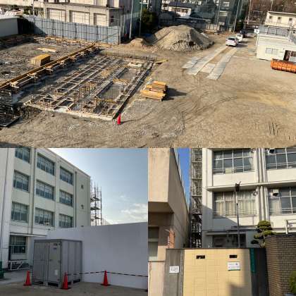 新しいプールと新しい体育倉庫等の枠組み(基礎)が見えてきました。合わせて関連工事で南館に作業用足場が設置されています。この土曜日には授業はありませんが、工事はあります。少し大きな音が出る工事となるようです。工事が長引くと月曜日に影響が出ます。工事関係者の皆さん、何とか音の出る工事は土曜日で終われるようよろしくお願いします。学校近隣の地域の方には本当にご迷惑をお掛けします。
