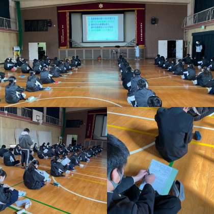 今日(3日)の5時限目に2年生は体育館で進路学習を受けています。3年生の進路がいよいよ大詰めで、来週は私学入試が大阪府で始まるということはすでにお知らせをしている通りですが、2年生一人ひとりが1月に行った職業レディネステストからまずは自分の行きたい学校探しに進みましょう。さあ、次は59期生の皆さんの番ですね。今から少しずつでも自らの将来について真剣に考えていってほしいものです。プレゼンでは高校調べ学習について映し出されていましたが、進路学習については班単位での学習から新聞作りにつなげるようですので調べた内容についてお互いに共有して頑張っていくことを期待します。