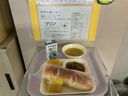 牛肉のデミグラスソース煮 コーンとはくさいのスープ かぼちゃのプリン 大型コッペパン(アプリコットジャム) 牛乳