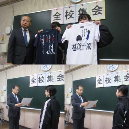 今日(15日)のオンライン全校集会では、いつものようにお話の前に伝達表彰を行いました。今回は2021年度大阪市中学校体育連盟軟式野球大会記念Tシャツのデザインに採用された2名に表彰状と記念Tシャツを授与しました。校長先生からは大阪市教育委員会教育長からのメッセージ「かけがえのない大切な存在である子どもたちへ」の紹介がありました。また、生徒会からは前回行われた小中交流交歓会の報告があり、生徒の皆さんに協力いただいた委員会活動や部活動についてのお礼と小学生がアンケートに書いてくれた内容についてありました。アンケートの一部ですが中学校での生活が楽しみと答えている6年生がほとんどだということが分かりました。加えて、アンケート結果の一部は保健室横に掲示しているので見てくださいとのことでした。