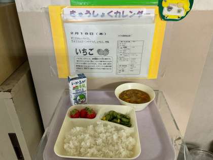 ポークカレーライス きゅうりとコーンのサラダ いちご 牛乳