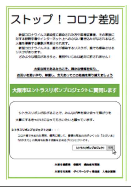 ◆大阪市のウェブページに「シトラスリボンプロジェクト」賛同の記事が掲載されています。下記のURLをクリックするとご覧いただけます。ご参照いただければ幸いです。