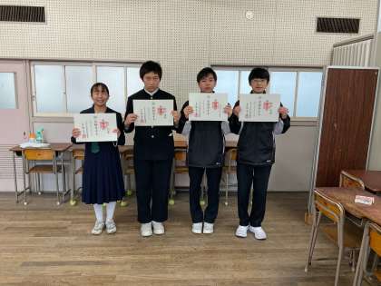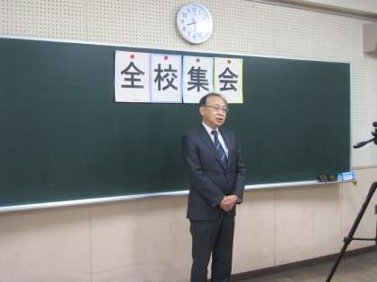 さて、集会ではいつものようにはじめに伝達表彰を行いました。今回は公益財団法人全日本剣道連盟より剣道2段、初段の賞状を披露いたしました。賞状を頂いた剣道部員の皆さん、練習の成果が実を結び良かったですね。これからも頑張りましょう。また、各種委員会からの報告として風紀委員会と保健委員会、図書委員会からのお話がありました。風紀委員会からはあいさつについて、「自主的にあいさつをしよう」という目標の確認がありました。保健委員会からは「感染症対策のために身の回りの清潔を保とう」という目標が伝えられ、「毎日爪のチェックを行う」との具体的な話がありました。爪が長いと細菌が多いとのこと、爪が0.5mmの場合と3mmの場合では、細菌が243倍多いことが最近の研究で分かっているとのことです。手を清潔にしましょう。図書委員会からは「本を借りる人を増やそう」という目標についてのお話でした。今年度は807冊の本の貸し出しがありました。昨年度は793冊でしたので今の時点で貸し出し数は増えましたが、春休みの貸し出しもありますので積極的に本を借りましょうと呼びかけがありました。1・2年生の皆さん、お昼休みの図書室の活用とあわせて、時間を見つけて本をたくさん読んでみましょう。もしかしたら興味深い本が見つかるかもしれません。