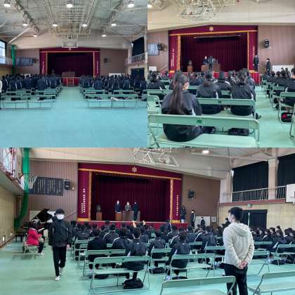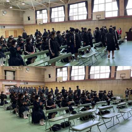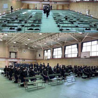 今日(9日)は午前中に3年生が卒業式の練習をしています。明日の公立高校一般kiri選抜入試の関係で予行は前日の11日です。さあ、明日受験する58期生の皆さんは気持ちをきり変えて頑張りましょう。今日の6時限目に事前指導を行います。