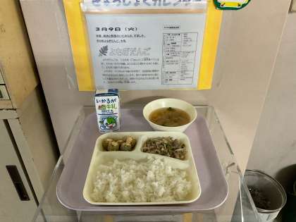 豚肉と野菜のいためもの すまし汁 きな粉よもぎだんご ごはん 牛乳
