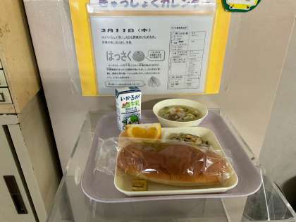 えびと野菜のいためもの 中華がゆ はっさく 大型コッペパン(バター) 牛乳