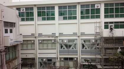 校舎の外装工事も、中庭側の足場の解体作業に入りました。