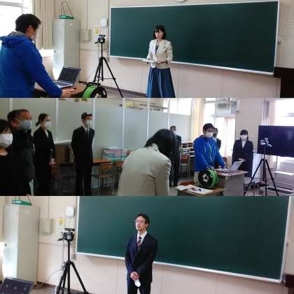 始業式はリモートによるオンライン形式で行いました。はじめに校長先生からのお話があり、続いて新しく本校に着任した先生方9名の紹介が行われ、代表で新教頭先生から着任のご挨拶を頂きました。続いて、校長先生より担任の先生・学年の先生、全体にかかわる職員のみなさんの発表と紹介をリモートで行いました。