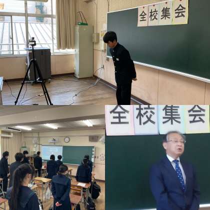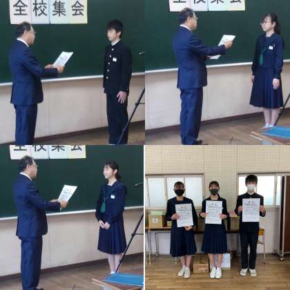 今日(12日)は定例の全校集会をリモートで行いました。賞状伝達が初めにあり、バドミントン部の仲間に伝達表彰を行いました。よく頑張って日ごろの練習の成果を発揮してくれました。おめでとございます。