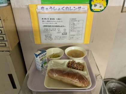 豚肉のデミグラスソース スープ キャベツとコーンのソテー 黒糖パン 牛乳