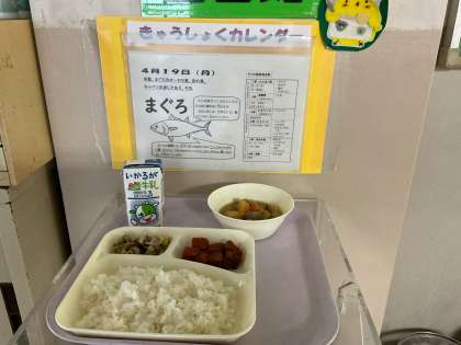 まぐろのオーロラ煮 含め煮 キャベツの赤じそあえ ごはん 牛乳