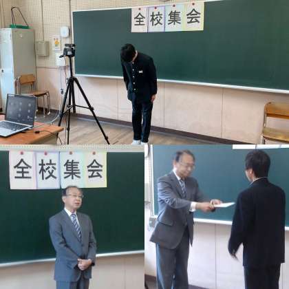 さて、今年度の2・3年生前期学級役員の認証式もリモートによるオンライン全校集会で行いました。校長先生からは各学年の学級委員代表者1名ずつに認証状が手渡されました。時間の関係で学級代表、風紀委員、美化委員、体育委員、保健委員、図書委員の皆さん一人ひとりに手渡すことができませんでしたが、学級のために頑張ってくれることでしょう。生徒の皆さんはしっかりと支え、協力し応援してほしいものです。