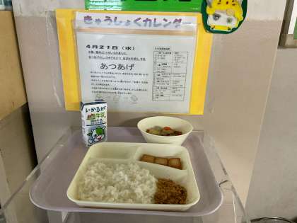 鶏肉とじゃがいもの煮もの あつあげのしょうゆだれかけ 紅ざけそぼろ ごはん 牛乳
