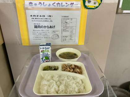 鶏肉のからあげ 中華スープ チンゲンサイともやしの甘酢あえ ごはん 牛乳