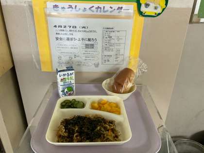 焼きそば きゅうりのしょうがづけ 黄桃(カット缶) 黒糖パン(1/2) 牛乳